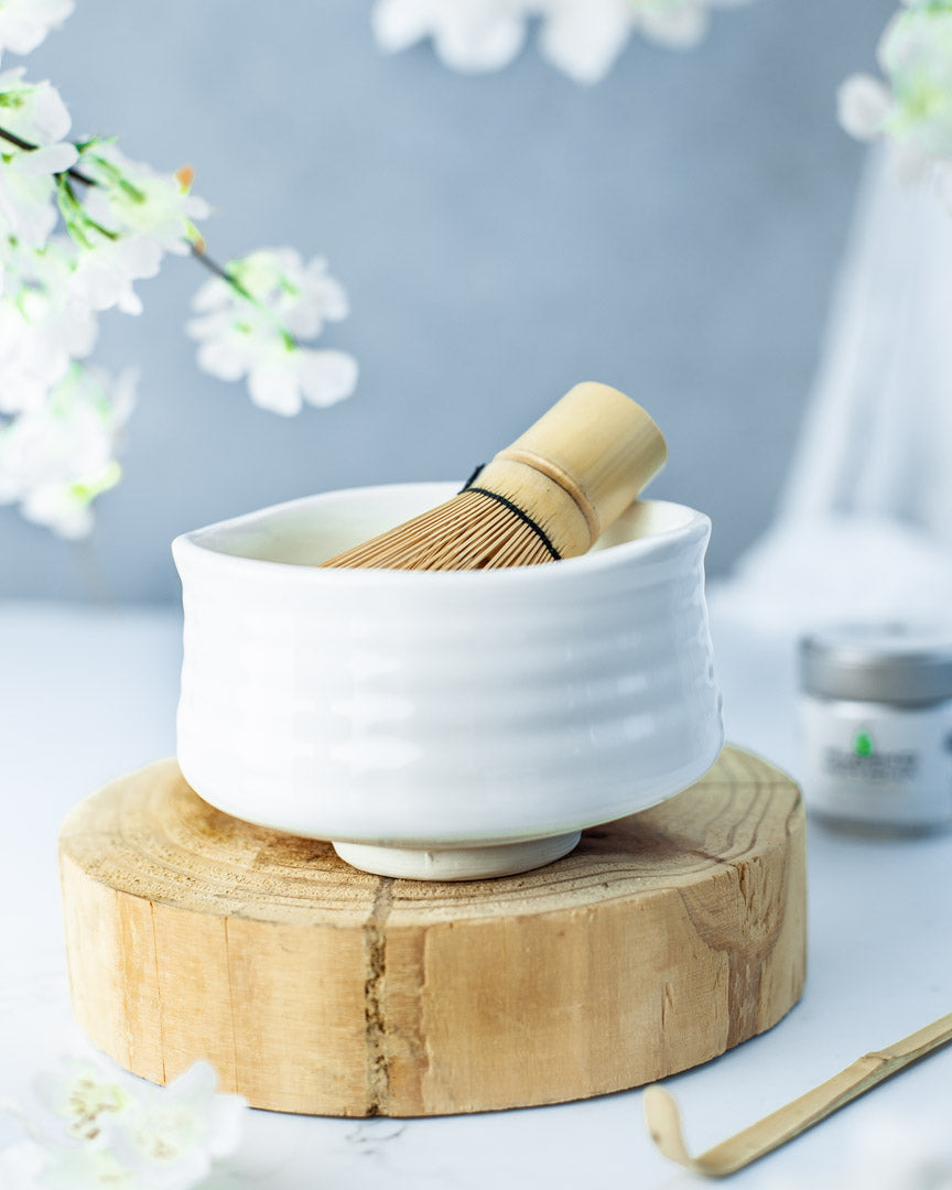 Son design épuré et sa blancheur immaculée mettent en valeur le vert intense du matcha, créant un effet visuel saisissant et une expérience de dégustation profondément zen.