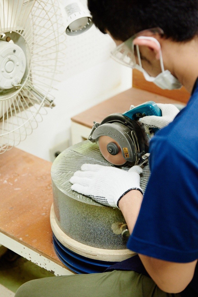 Les artisans taillent 2 pierres de granit qui doivent s'emboîter et avec un trou au milieu pour faire passer les feuilles de thé tencha.