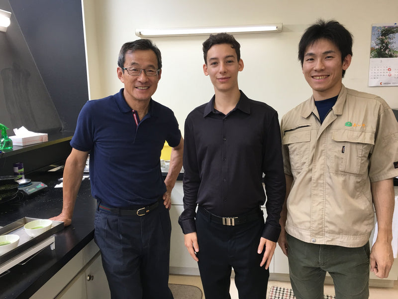 Ici je suis avec Daishi-san et le “tea master” qui est aussi le frère du président de l'entreprise. C'est lui qui sélectionne les feuilles et fait l’assemblage premium.