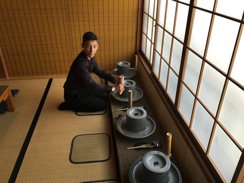 Sur la photo, je suis en train de mouliner le thé manuellement pour le réduire en une poudre très fine… le thé matcha !